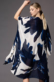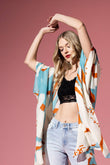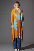 Long silhouette kimono encapsulating a sweeping floral print on a wide scale